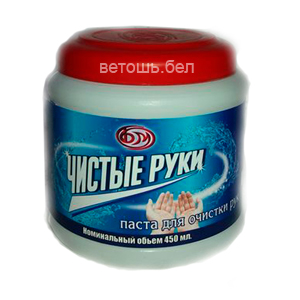 Паста очищающая для рук “Чистые руки” предназначена для очистки рук от сильных загрязнений, удаляет липкие вещества, смазку, шпатлевку, битум, сажу и другие загрязнения.